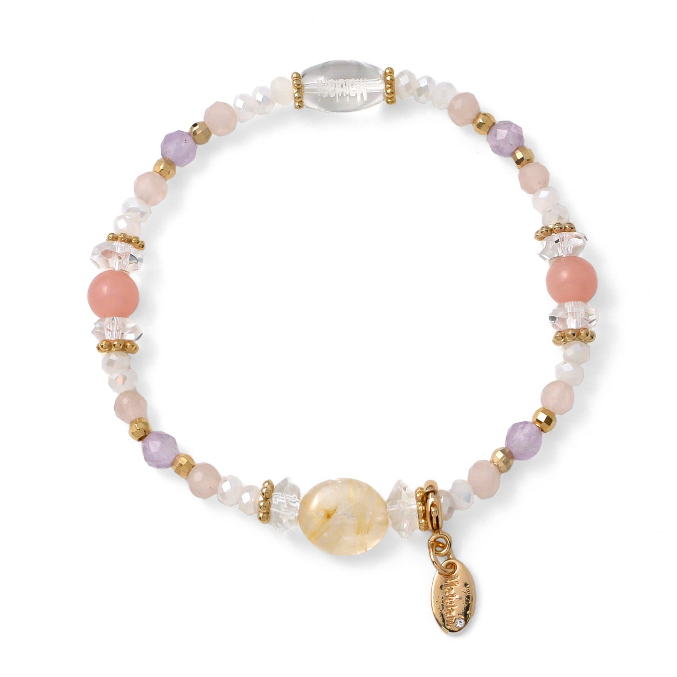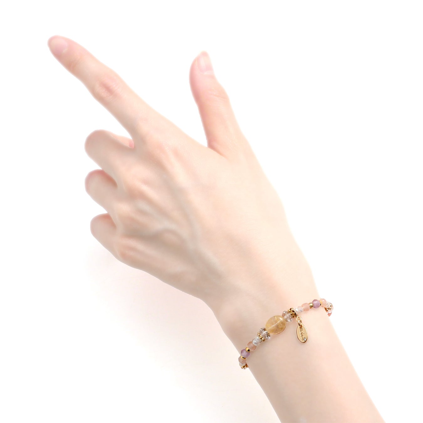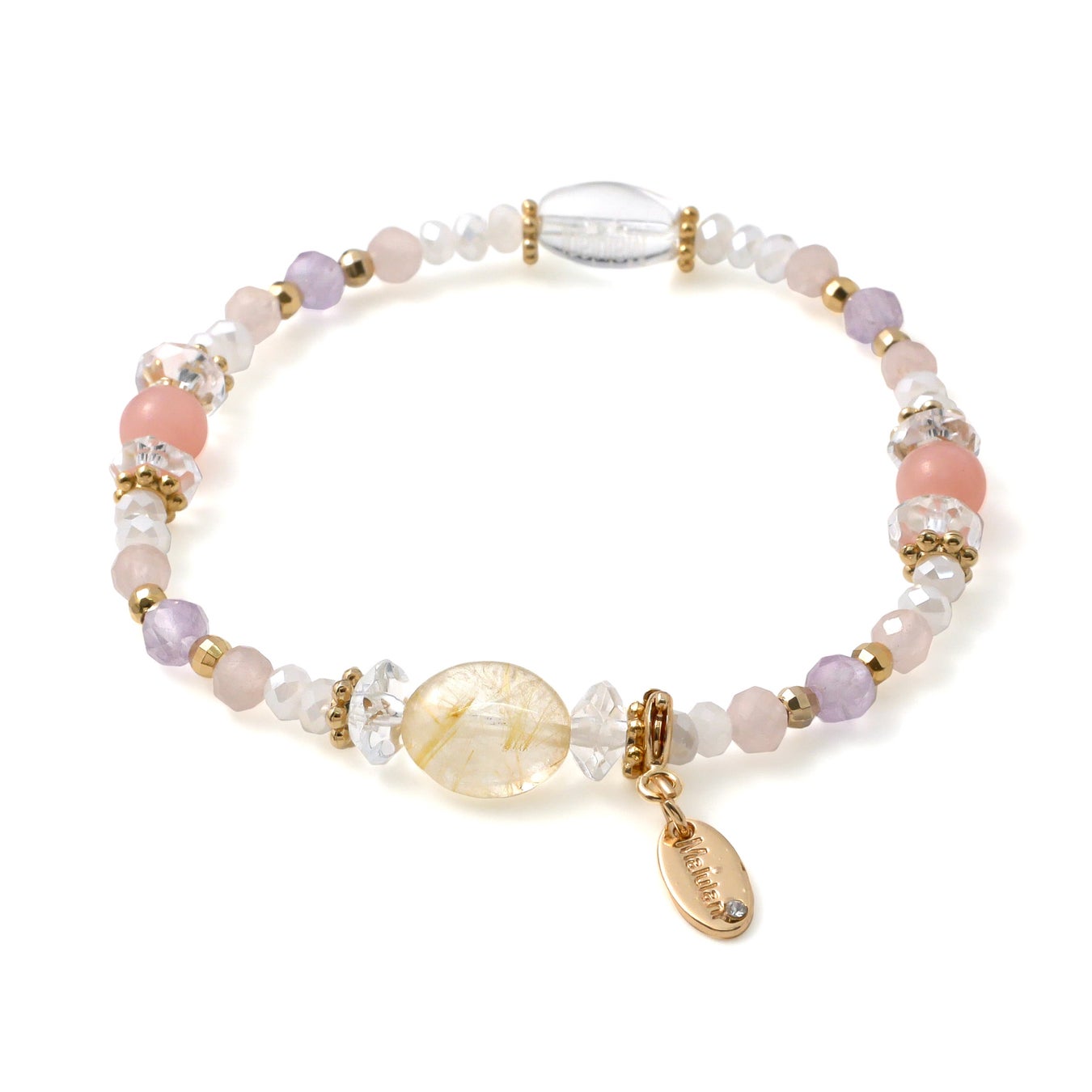 ピンクを基調としたペールトーンの淡いブレスレットは、花びらが陽光を浴びてきらめく瞬間をイメージ。選び抜かれた5種類のパワーストーンが、金運・愛情・魅力の向上をサポートします。