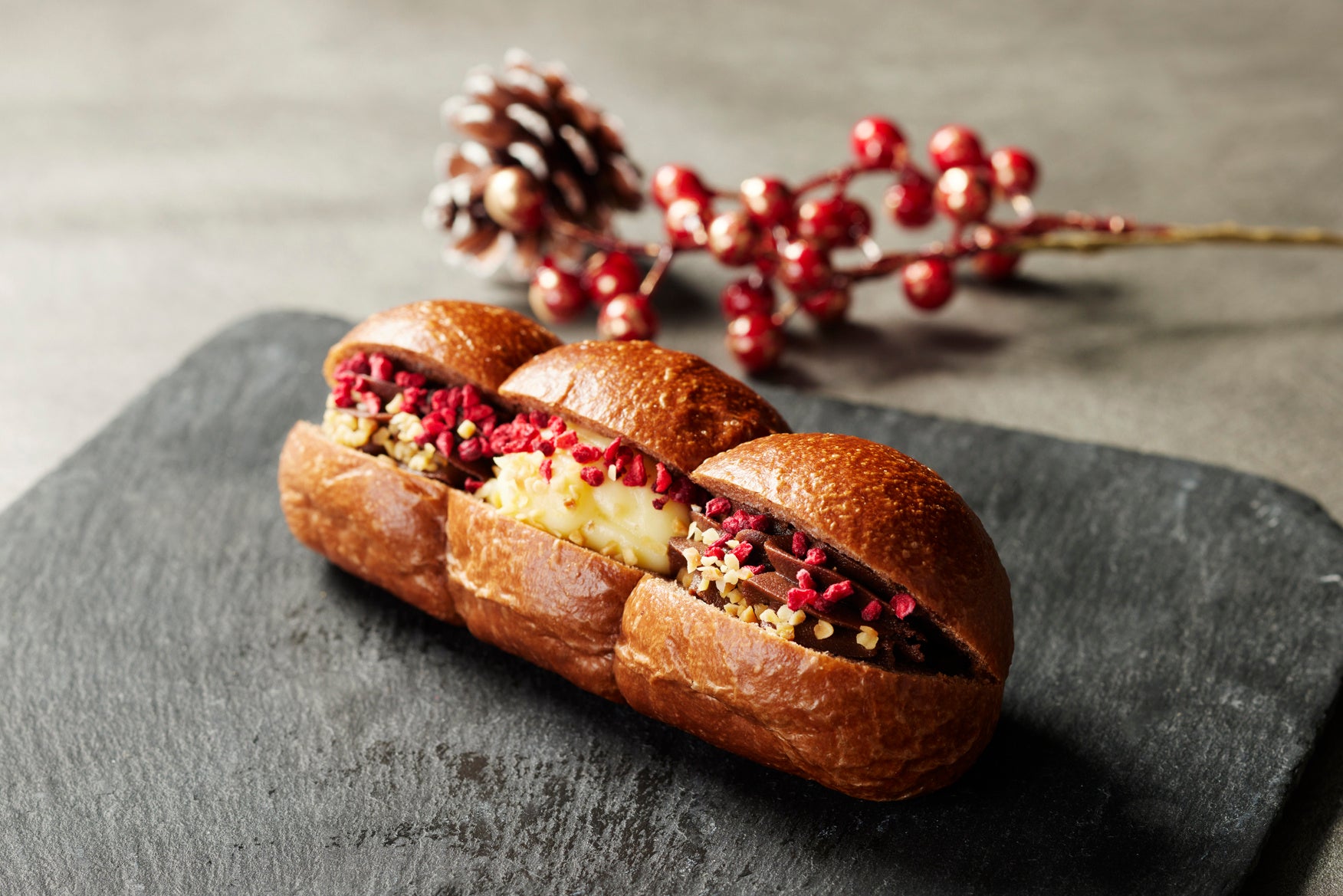 ビターなショコラ生地の両サイドにチョコレートカスタード、真ん中にはホワイトチョコレートカスタードをたっぷりはさみ、食感と香りのアクセントにフリーズドライのフランボワーズと砕いたアーモンドをまぶした冬限定のちぎりパンです。