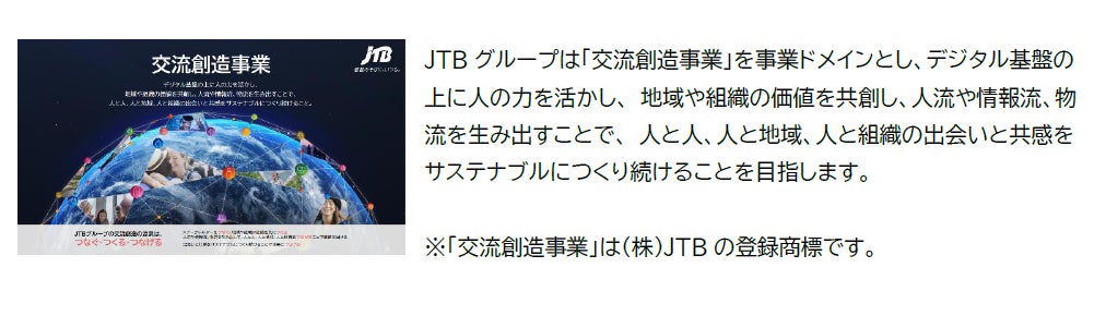 JTBグループは「交流創造事業」を事業ドメインとし、デジタル基盤の上に人の力を活かし、 地域や組織の価値を共創し、人流や情報流、物流を生み出すことで、 人と人、人と地域、人と組織の出会いと共感をサステナブルにつくり続けることを目指します。