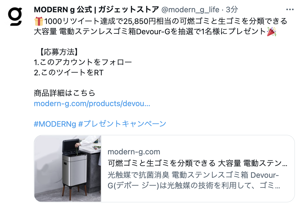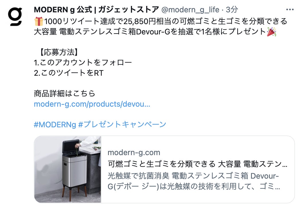 【25,850円相当の可燃ゴミと生ゴミを分類できる 大容量 電動ステンレスゴミ箱Devour-Gを抽選で1名様にプレゼント】MODERN gの公式Twitterで毎日ギブアウェイキャンペーン中!