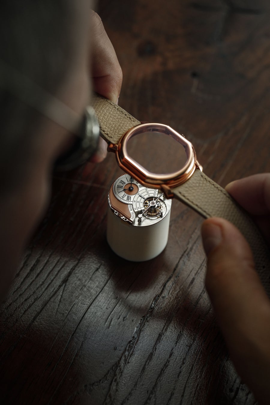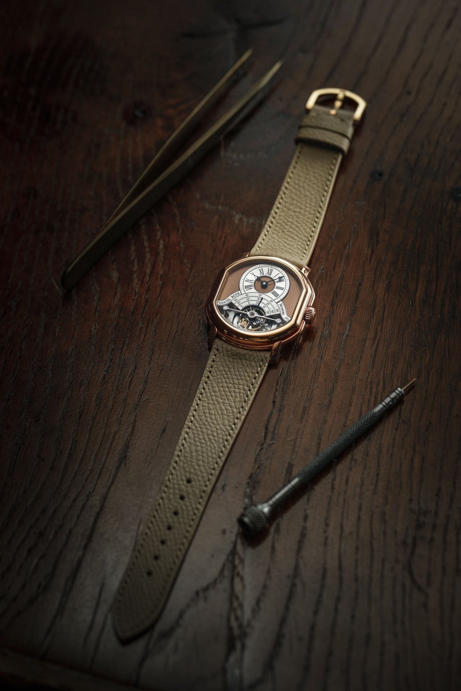 18K ローズゴールドのケースは、ダブルエリプス状に仕上がっています。これは、1988年にブランドを立ち上げた時にダニエル·ロート自身が生み出した、ダニエル·ロートの礎を成すシェイプです。四角と円を組み合わせたダブルエリプスケースは、目立つトゥールビヨンを6時位置に配置するために考案されたもの。誕生からおよそ30年、ダブルエリプスケースは今や、時代を超えたアイコンとなった数少ない現代的ケースデザインの1つとなっています。