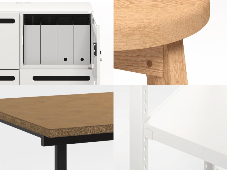 無印良品の店舗で実際に使われている什器・備品を元に、オフィスや店舗など様々な場所に設置しても調和が