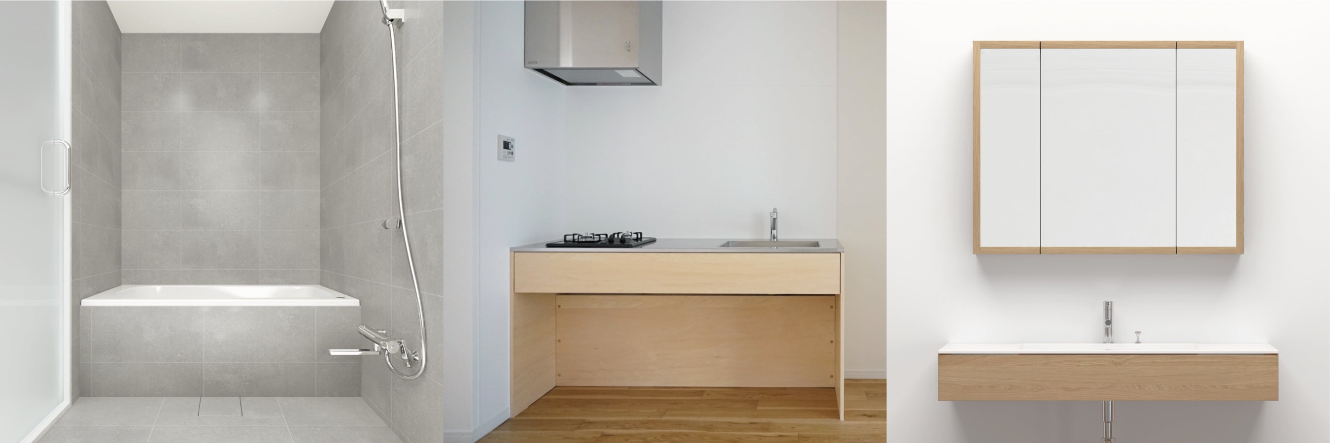 無印良品の家やMUJIHOTELで使用している洗面台やキッチン、タイルのユニットバスなど、素材感や使い勝手