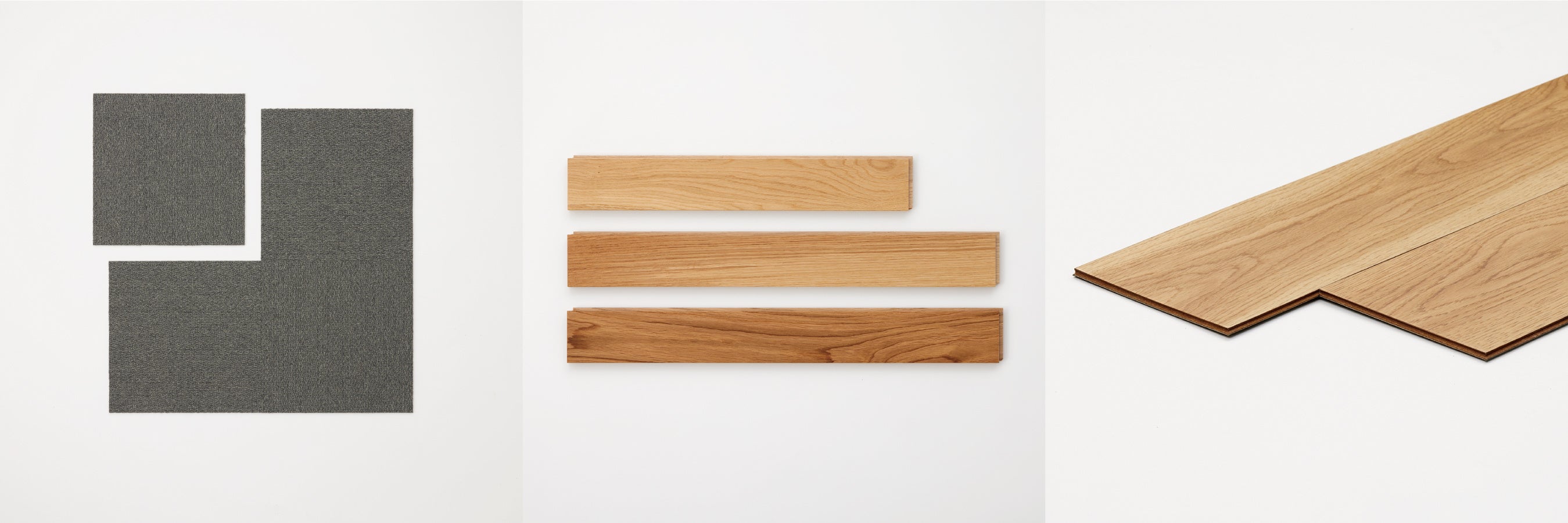 無印良品の店舗でも実際に使われている国産材をつかった床、使用済みカーペットを回収し、再素材化した原料