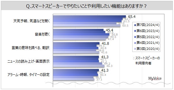 <今 回>(2024/4)https://myel.myvoice.jp/products/detail.php?product_id=30907 上記設問の他に、スマートスピーカーの「認知」「購入時の重視点」も聞いています。 <第6回>(2023/4)https://myel.myvoice.jp/products/detail.php?product_id=29710 <第5回>(2022/4)https://myel.myvoice.jp/products/detail.php?product_id=28508 |