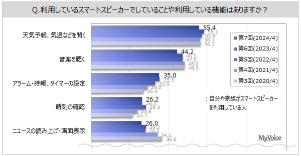 過去調査と比べて、「アラーム・時報、タイマーの設定」が増加傾向、「ニュースの読み上げ・画面表示」が減少傾向です。