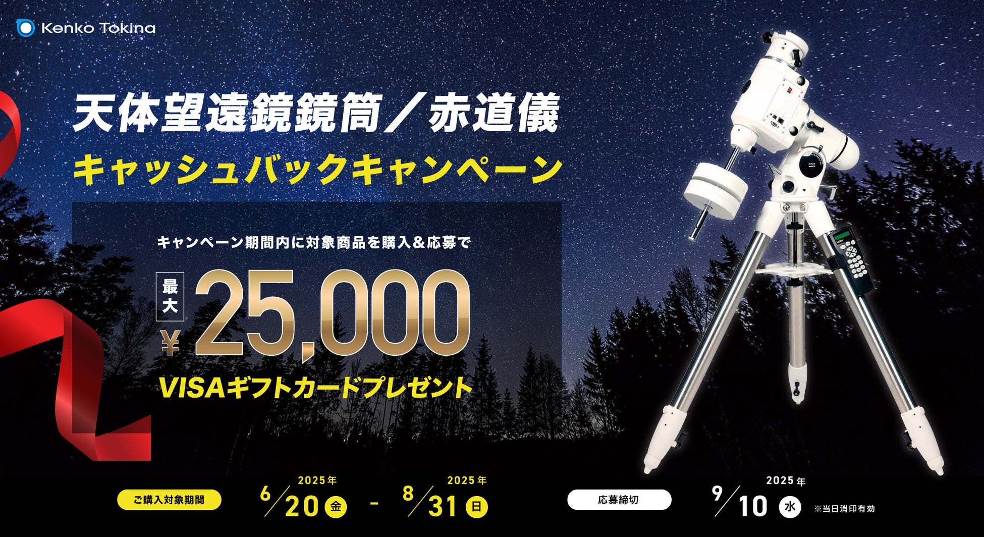 株式会社ケンコー・トキナー(本社:東京都中野区中野 代表取締役社長:櫻井 匡)は、2025年6月20日から2025年8月31日の期間中に対象の天体望遠鏡/赤道儀をご購入の上、所定の応募用紙でご応募いただいたお客様に、最大25,000円分を還元する「天体望遠鏡/赤道儀キャッシュバックキャンペーン」を実施いたします。