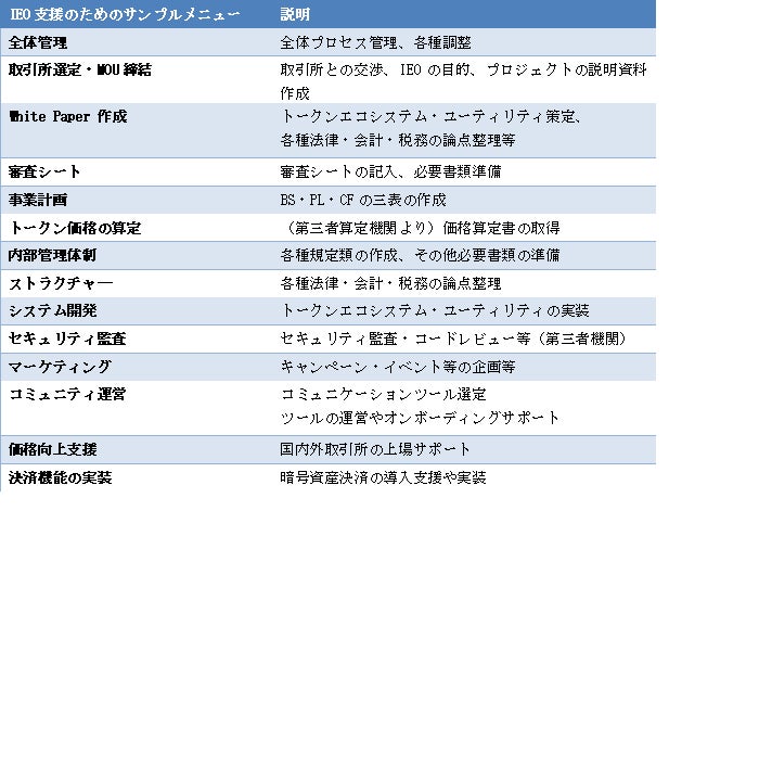 「IEO支援サービス」では、以下のメニューを組み合わせて提供します。