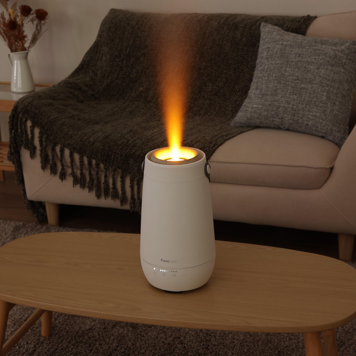 蒸気がまるで暖炉の炎のように揺らいで見える加湿器。ライトはオレンジとブルーの2色に点灯。