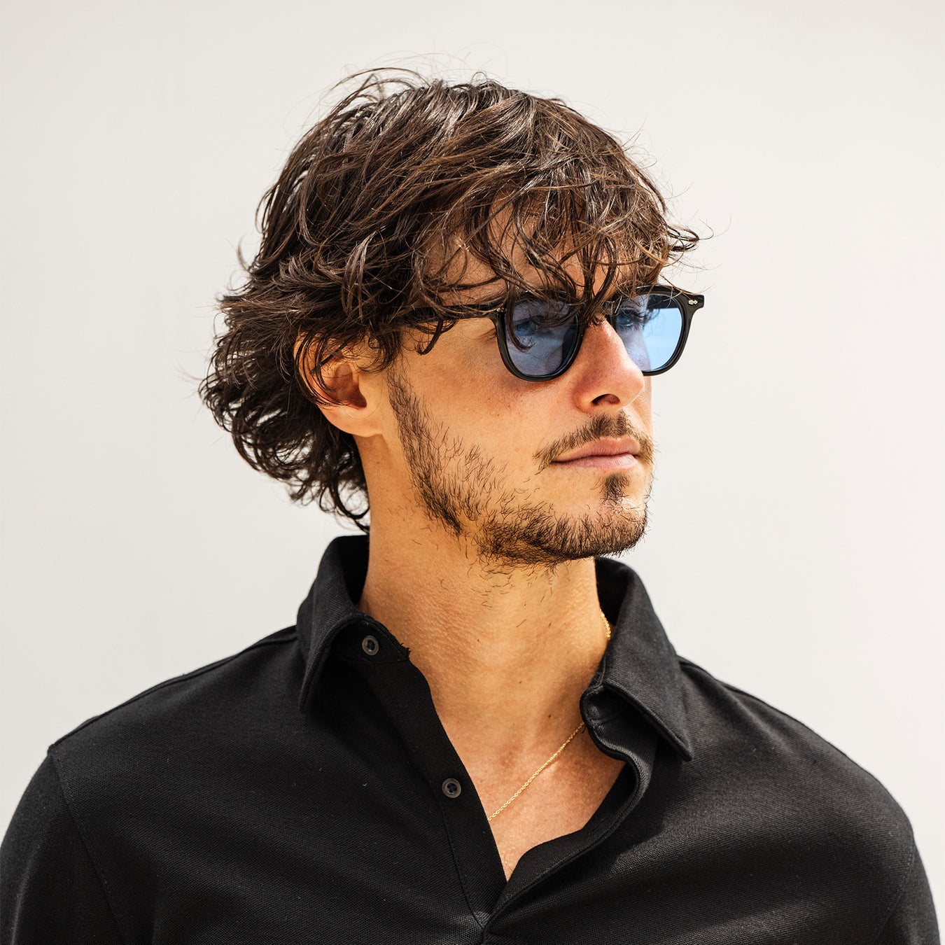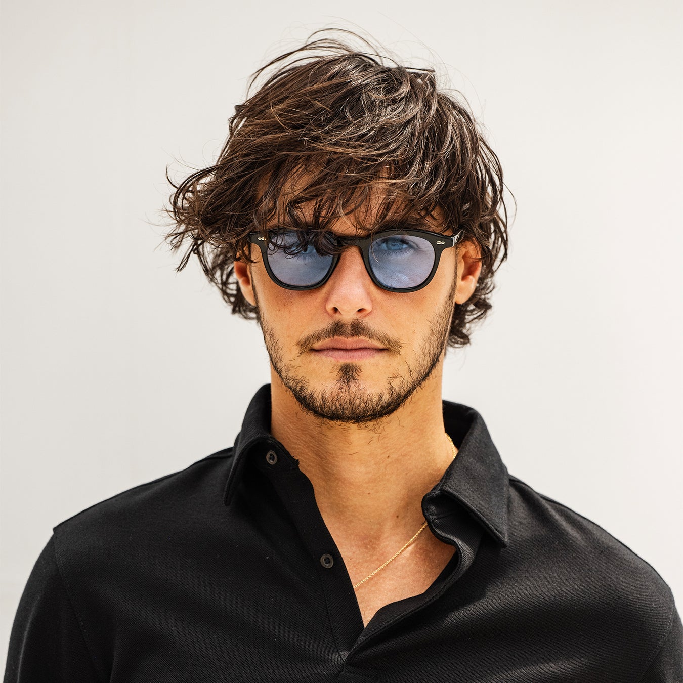 やや丸みを帯びた逆台形のレンズシェイプは、彫りの深浅を問わず似合いやすく、重宝すること間違なしの一本です。