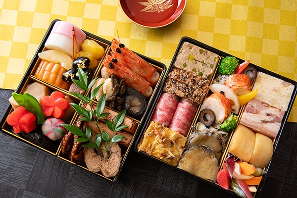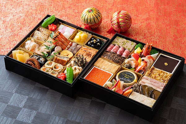 新年を華やかに彩るおせち。縁起物とされる伝統的な正月料理を盛り込んだ日本料理と、オマール海老やたらば蟹、フォワグラ、黒毛和牛など を贅沢に使用した西洋料理をご用意します。