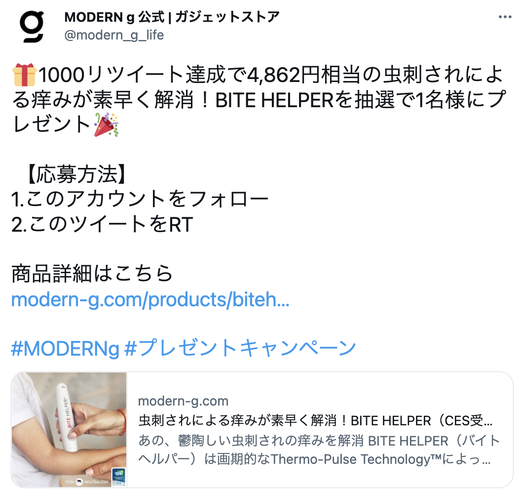 【4,862円相当の虫刺されによる痒みが素早く解消!BITE HELPERを抽選で1名様にプレゼント】MODERN gの公式Twitterで毎日ギブアウェイキャンペーン中!