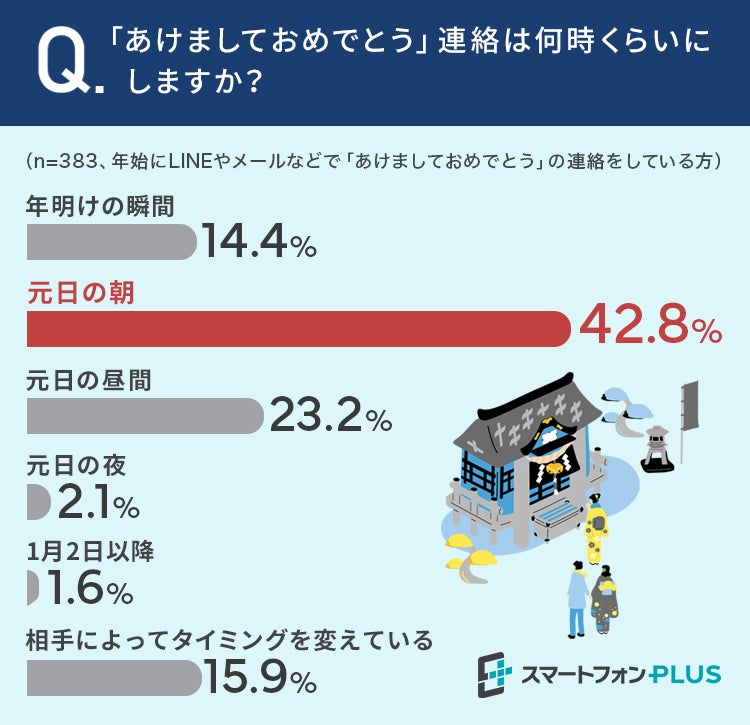 ■42.8%が「元日の朝」に「あけましておめでとう」の連絡をする