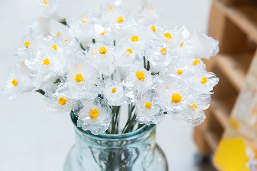 鉄道遺失ビニール傘から再生されたアップサイクルフラワーを手にしていただき、廃棄物・環境問題に目を向けていただければと存じます。