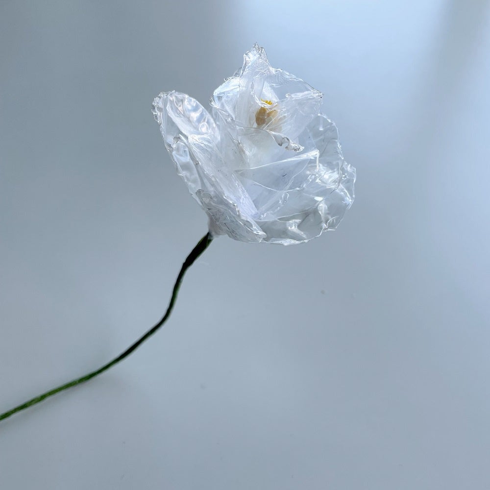 回収された傘は、解体・洗浄され、プレス機で何層にも圧着することで半透明で凸凹した素材の再生生地となります。出来上がった生地は、octangle合同会社にて職人が一人ひとりハンドメイドで花を作成、光に反射するとキラキラ光る透明な花、アップサイクルフラワーへと再生されます。
