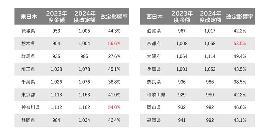 東日本の集計地域では、改定影響率が最も高い地域は栃木県の56.6%
