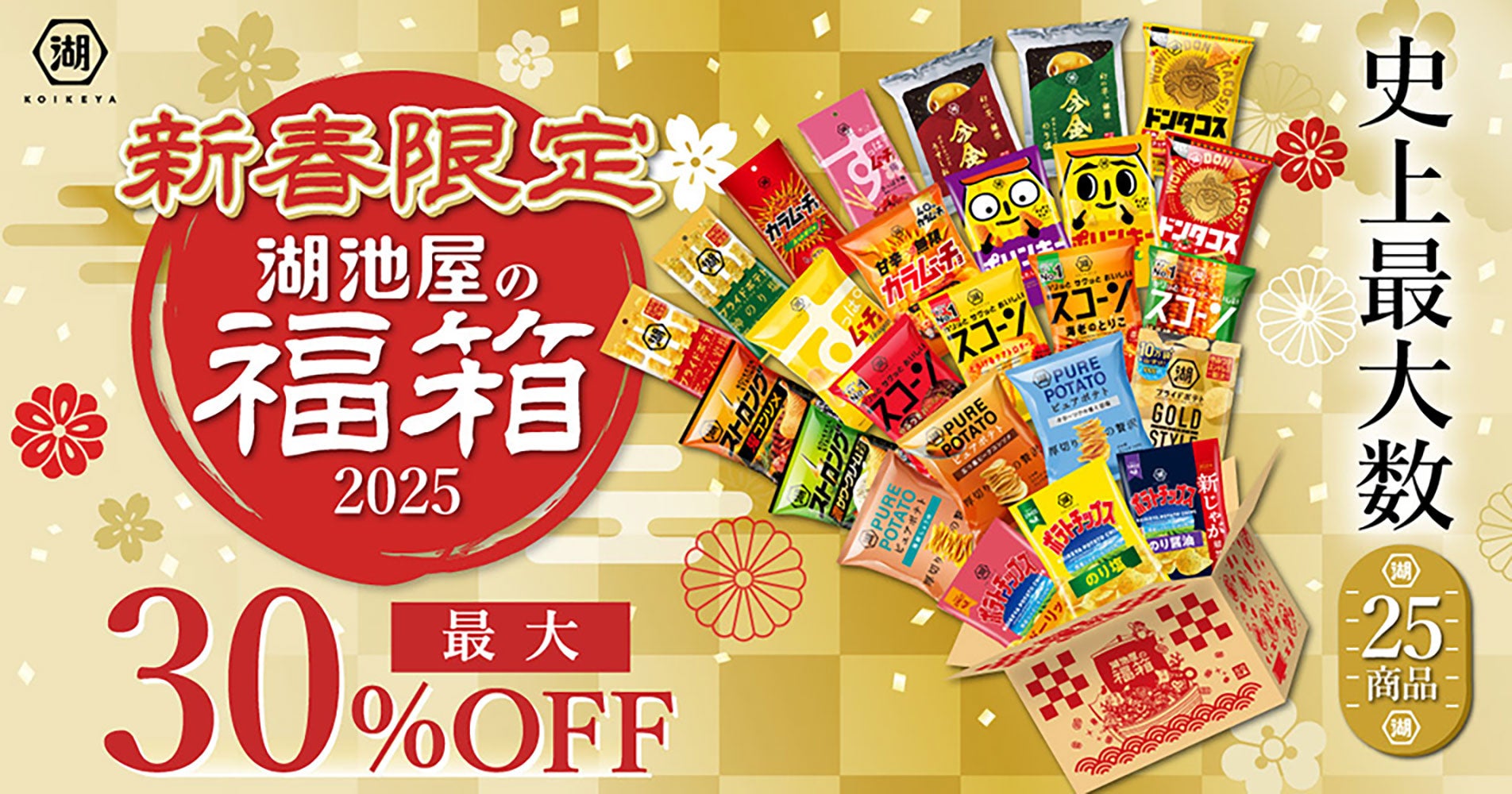 株式会社湖池屋(社長:佐藤章)は、湖池屋オンラインショップにおいて、通常販売価格から最大30%OFF※でお買い求めいただける「新春セール2025」を、2025年1月1日(水)0時~1月7日(火)15時まで開催します。