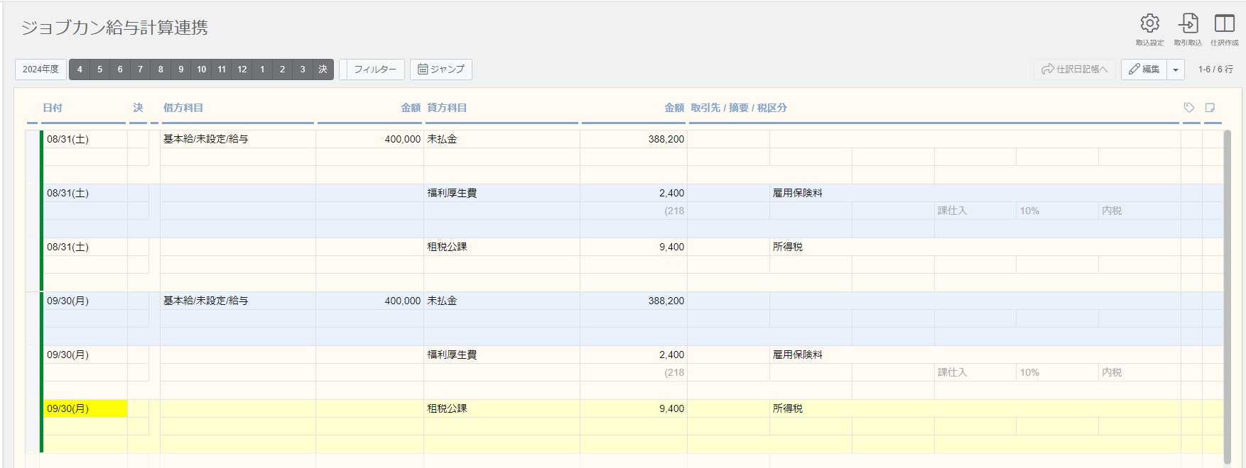 『ジョブカン給与計算』にて給与の計算内容を確定させた後、『ジョブカン会計』に給与データを取り込むことで、連携画面に給与データを反映します。連携画面からはワンクリックで会計業務に必要な「給与手当」、「社会保険料」、「源泉所得税」などの仕訳データを作成することができます。