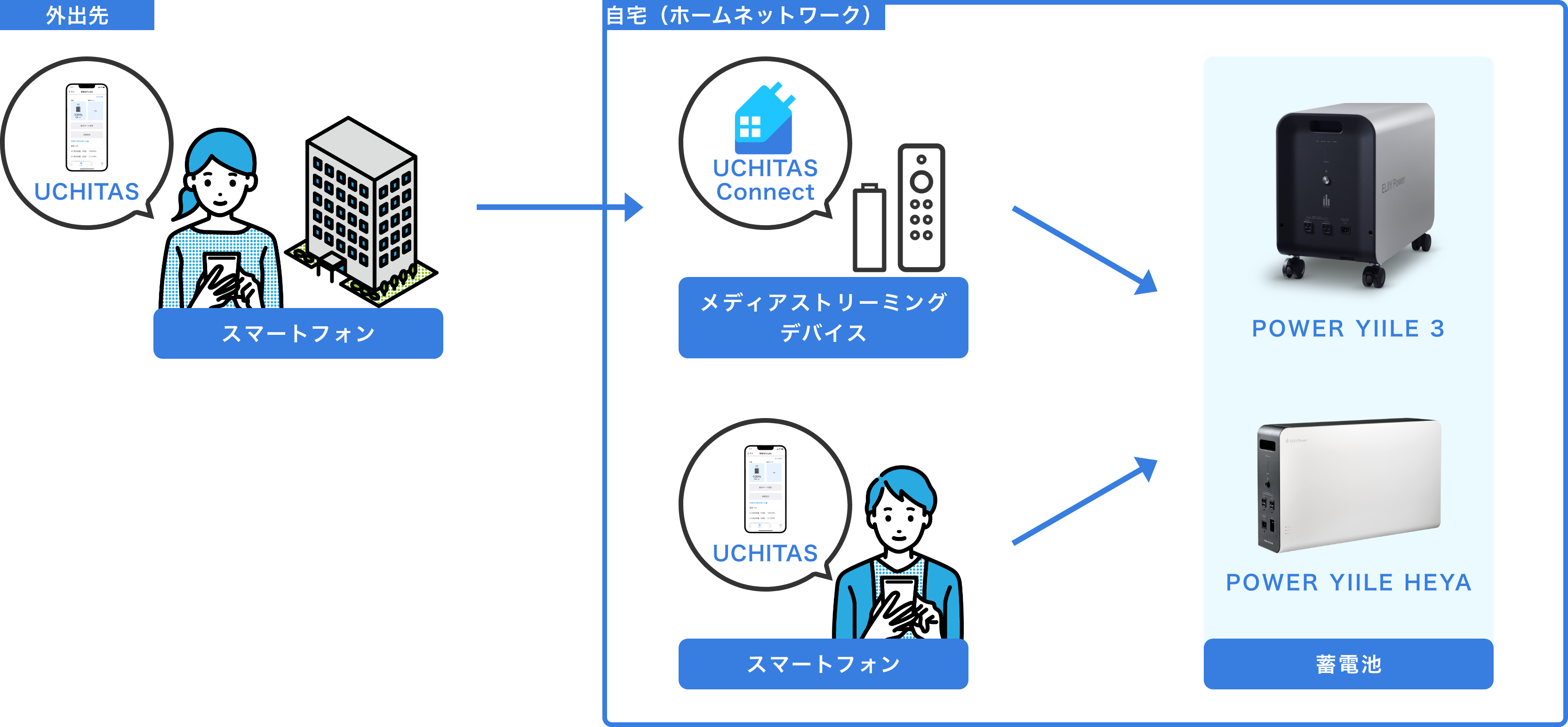 <スマホから「UCHITAS」を活用したエリーパワー蓄電池の操作イメージ>