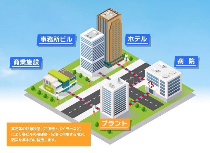 エリア全体の冷暖房・給湯などに利用する冷水と蒸気を地区内のプラントで集中的に製造し、導管を通じて供給するシステムです。 個々の建物で熱源設備を設置する個別熱源方式に比べ、プラントに熱源設備が集中していることにより、省エネルギー効果等、環境保全に大きな役割を果たしています。