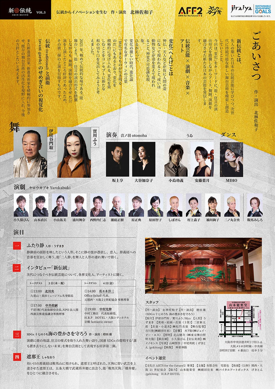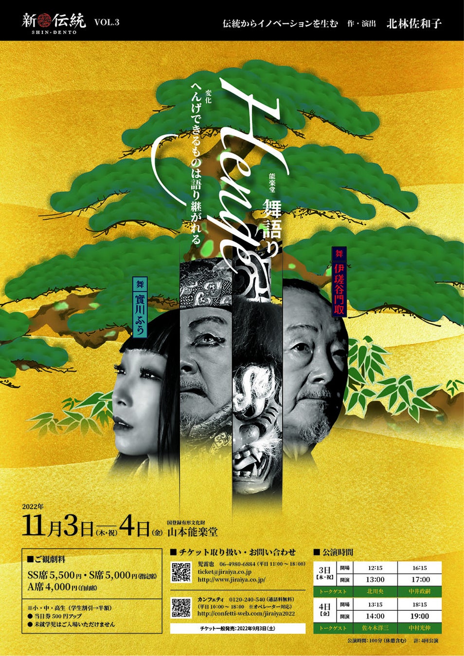 JIRAIYA 新伝統vol.3 能楽堂 舞語り『Henge』へんげできるものは語り継がれる が2022年11月3日 (木・祝)~11月4日 (金)に山本能楽堂(大阪市中央区)にて上演されます。チケットはカンフェティ(運営:ロングランプランニング株式会社、東京都新宿区、代表取締役:榑松 ⼤剛)にて発売中です。