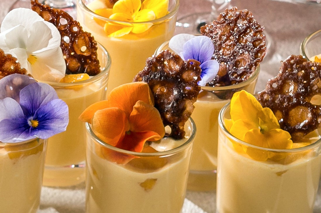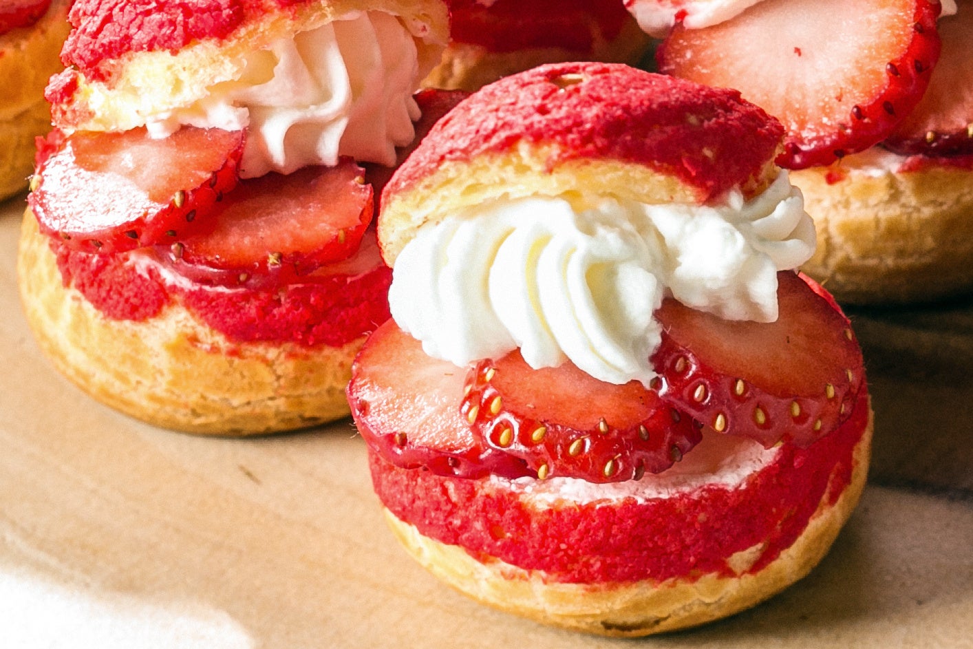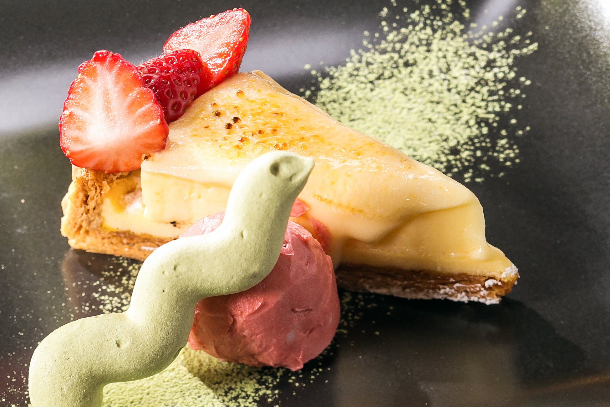 ふわふわのシブーストクリームとサクサクのパイ生地のマリアージュを楽しめる大人のデザート。表面をこんがりと焼き上げることで風味豊かな味わいに仕上げています。一緒に添えたラズベリーアイスの酸味と、抹茶メレンゲのほろ苦さが味の変化を楽しめる新感覚デザートです。