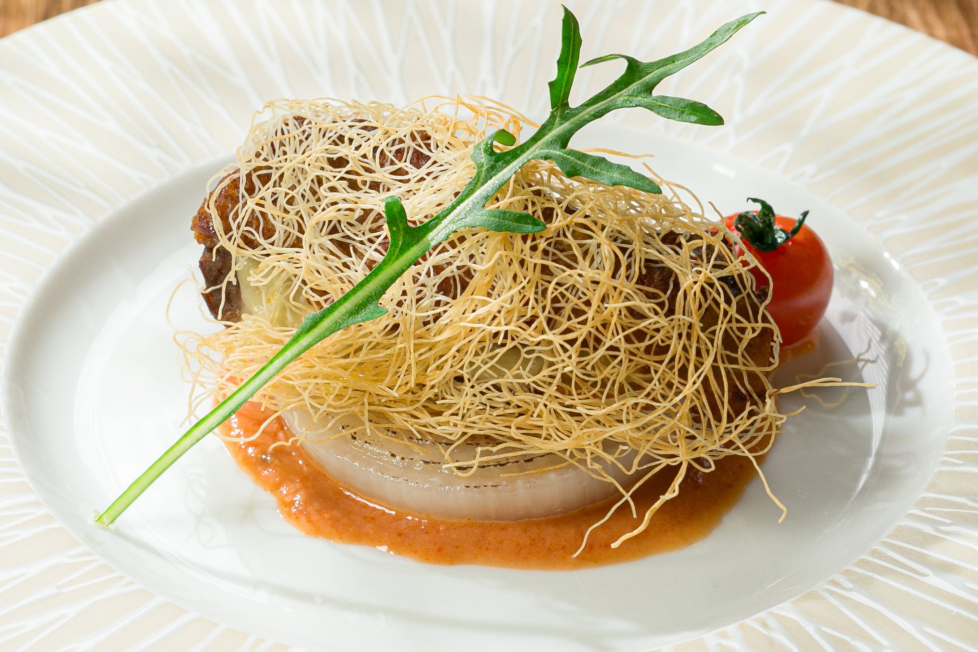 柔らかな広島赤鶏をカダイフで巻いて焼き上げ、ふっくらサクサクの食感に仕上げました。チーズのクリーミーな味わいが、トマトクリームソースの甘味と香りをより一層引き立てています。
