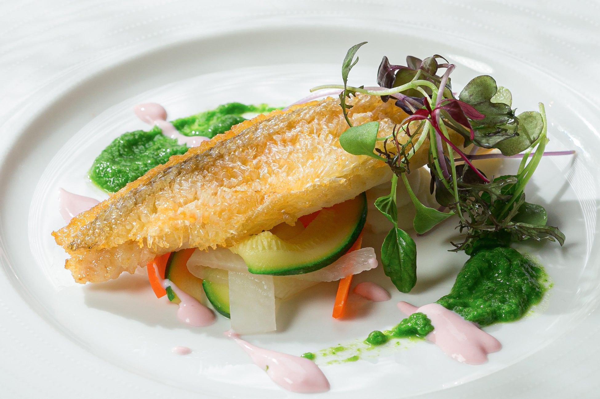 甘鯛の鱗をサクサクと焼き上げ、食感を楽しめるよう仕上げています。県内産菜の花のクーリーソースとピンク色のバンブランソースが、春らしい見た目と味わいを届けてくれます。
