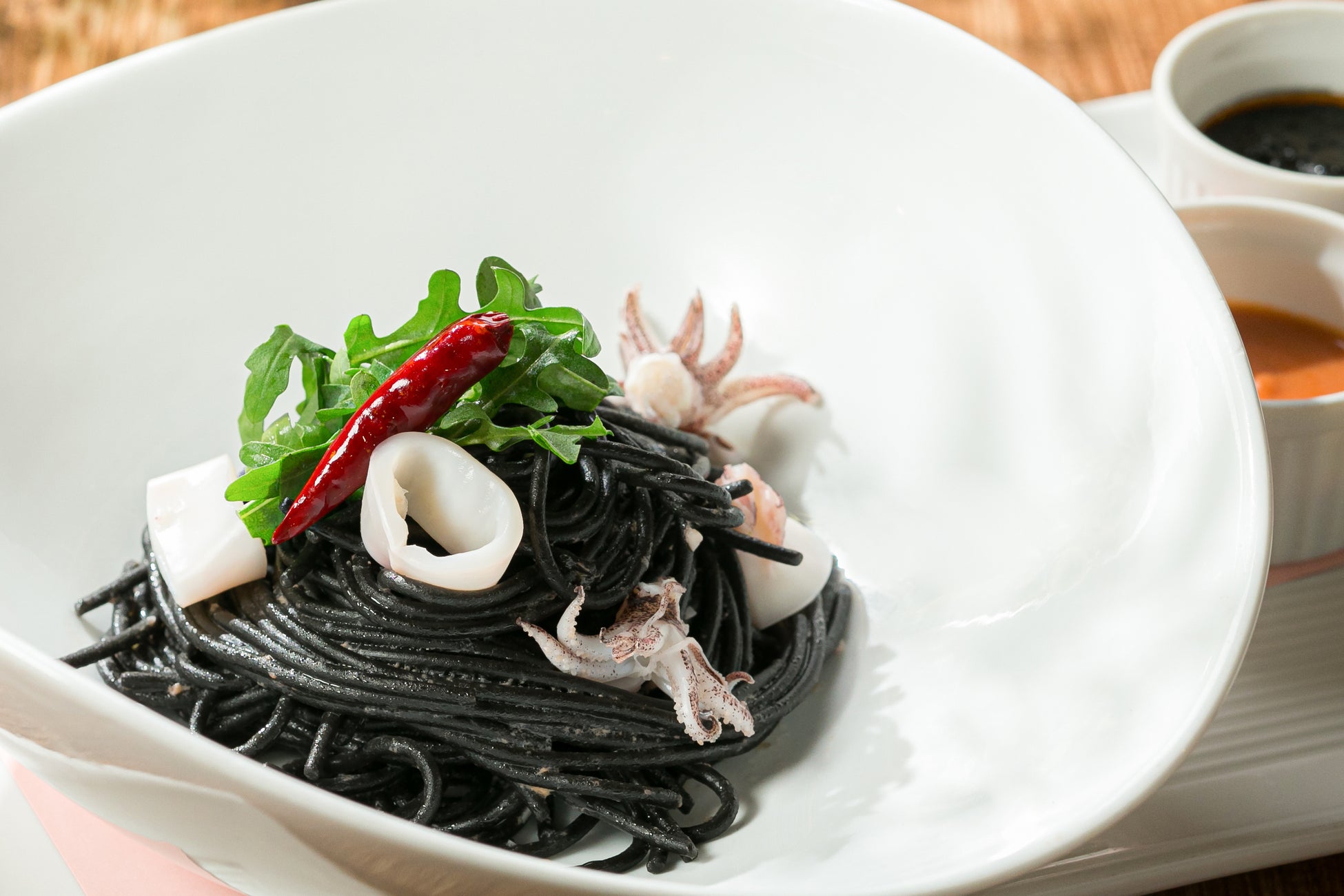 イカ墨パスタと烏賊を合わせペペロンチーノ風に仕上げました。味の変化を楽しめるようイカ墨ソースとトマトソースの2種のソースを添えました。