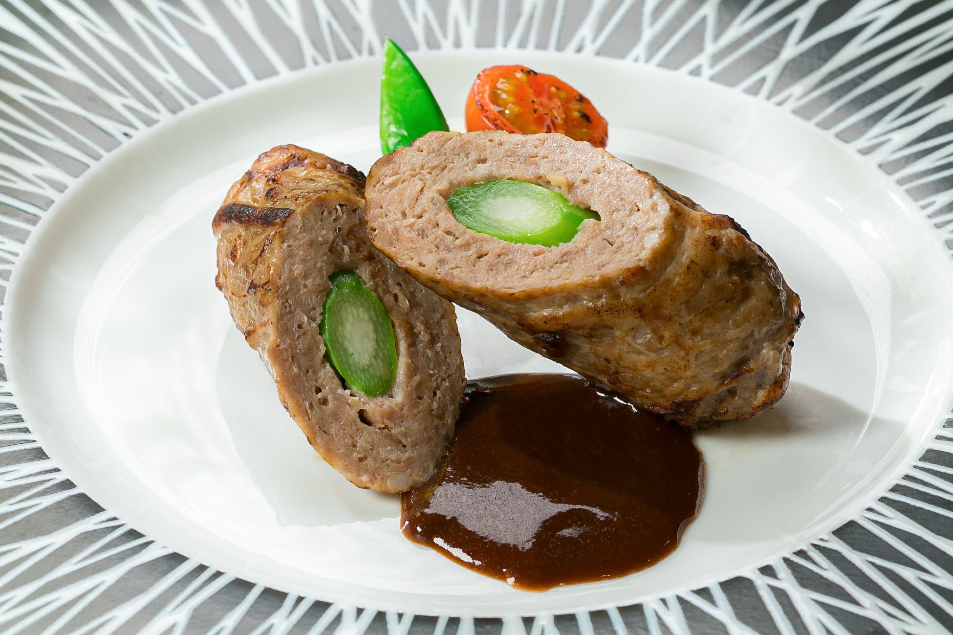 オリジナルハンバーグの中にアスパラガスを巻き込み、クレピネットで旨味を閉じ込めて焼き上げました。コクと深みのある赤ワインをベースにしたデミグラスソースでお楽しみいただけます。