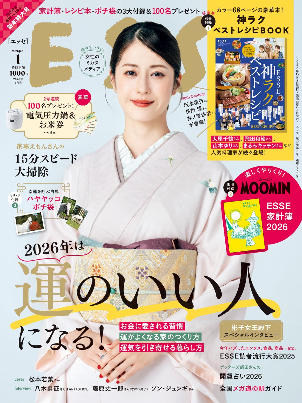 また、『ESSE』1月号本誌では、「2026年は運のいい人になる!」 「スピード15分大掃除」 「松本若菜さんインタビュー」「ゲッターズ飯田さんの2026年開運占い」 「八木勇征さんインタビュー」など特集が盛りだくさん。