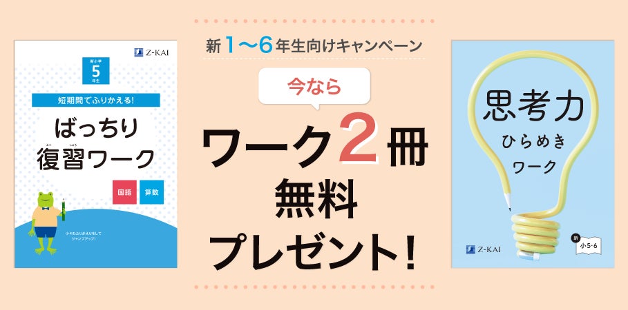 株式会社増進会ホールディングス(Z会グループ)のグループ会社である株式会社Z会は、「Z会の通信教育」小学生向けコースにおいて、2025年12月1日(月)~2026年4月30日(木)に資料をご請求いただいた方に、『1年生にジャンプ!ばっちりスタートワーク』(新小1対象)もしくは『短期間でふりかえる!ばっちり復習ワーク』(新小2~6対象)と、『思考力ひらめきワーク』(学年別)の2冊を無料でプレゼントします。ぜひこの機会にお申し込みください。