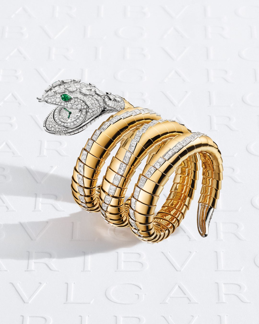 ブルガリでアイコンとなっている蛇は、再生と変身を最も魅惑的な形で体現されています。「セルペンティ ミステリオーシ ドラゴーネ」はその蛇とドラゴンを模ったタイムピースです。1962年にローマのチネチッタスタジオでエリザベス テイラーがクレオパトラを演じたときに作られた、歴史に残るウォッチに新しい解釈を加えながらも、蛇の体は当時のままのトゥボラリブレスレット、ヘッドのバケットカットダイヤモンドも同じようにあしらわれています。