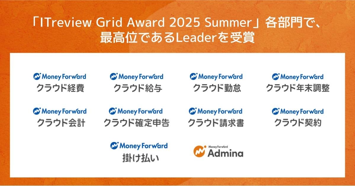 マネーフォワードグループが提供する10プロダクトが、アイティクラウド株式会社主催「ITreview Grid Award 2025 Summer」の各部門にて、最高位である「Leader」を受賞しました。今回受賞したプロダクトは、株式会社マネーフォワードのバックオフィスSaaS『マネーフォワード クラウド』の8プロダクト、マネーフォワードケッサイ株式会社の企業間後払い決済・請求代行サービス『マネーフォワード 掛け払い』、マネーフォワードi株式会社の情シス向け業務OS『マネーフォワード Admina』です。