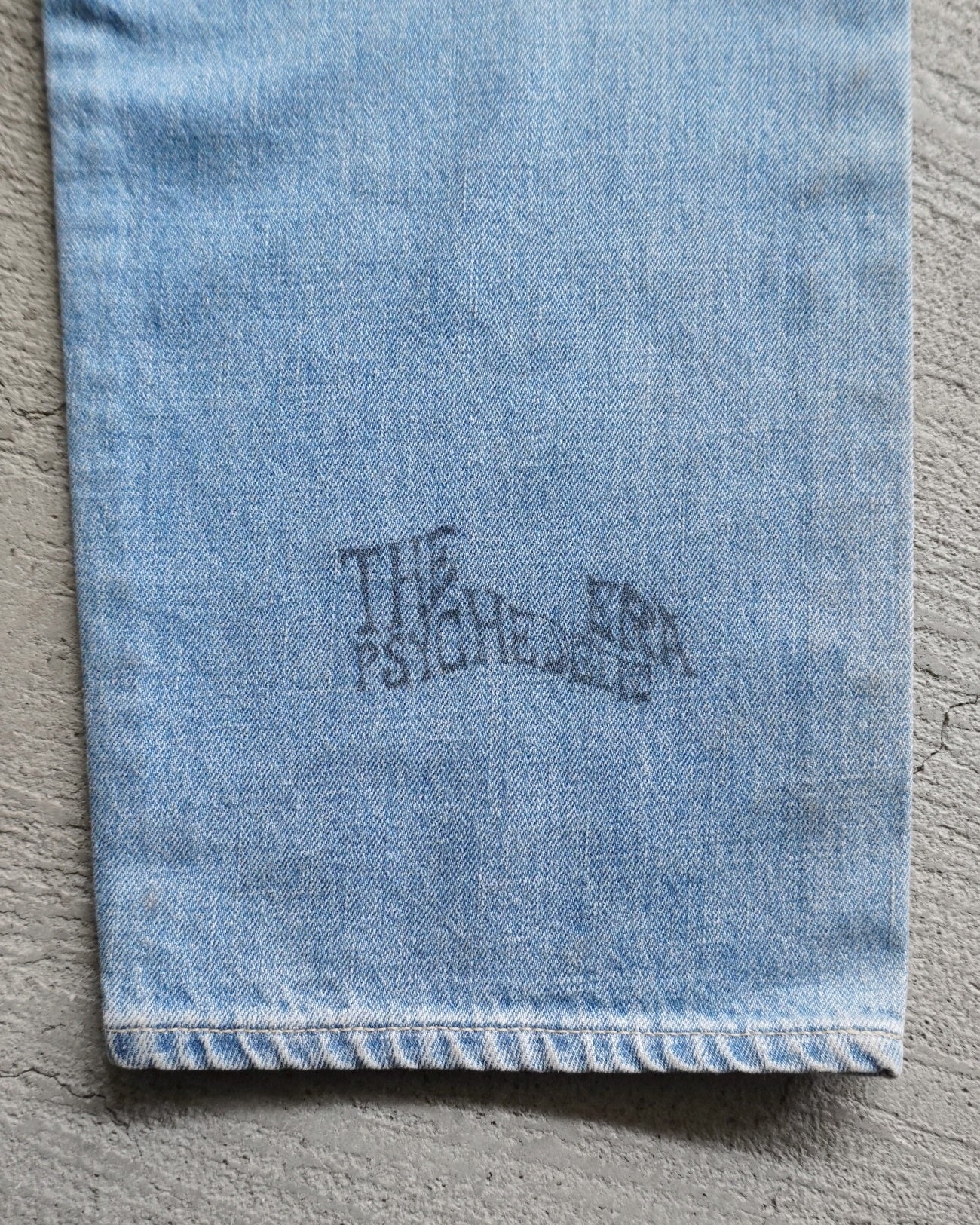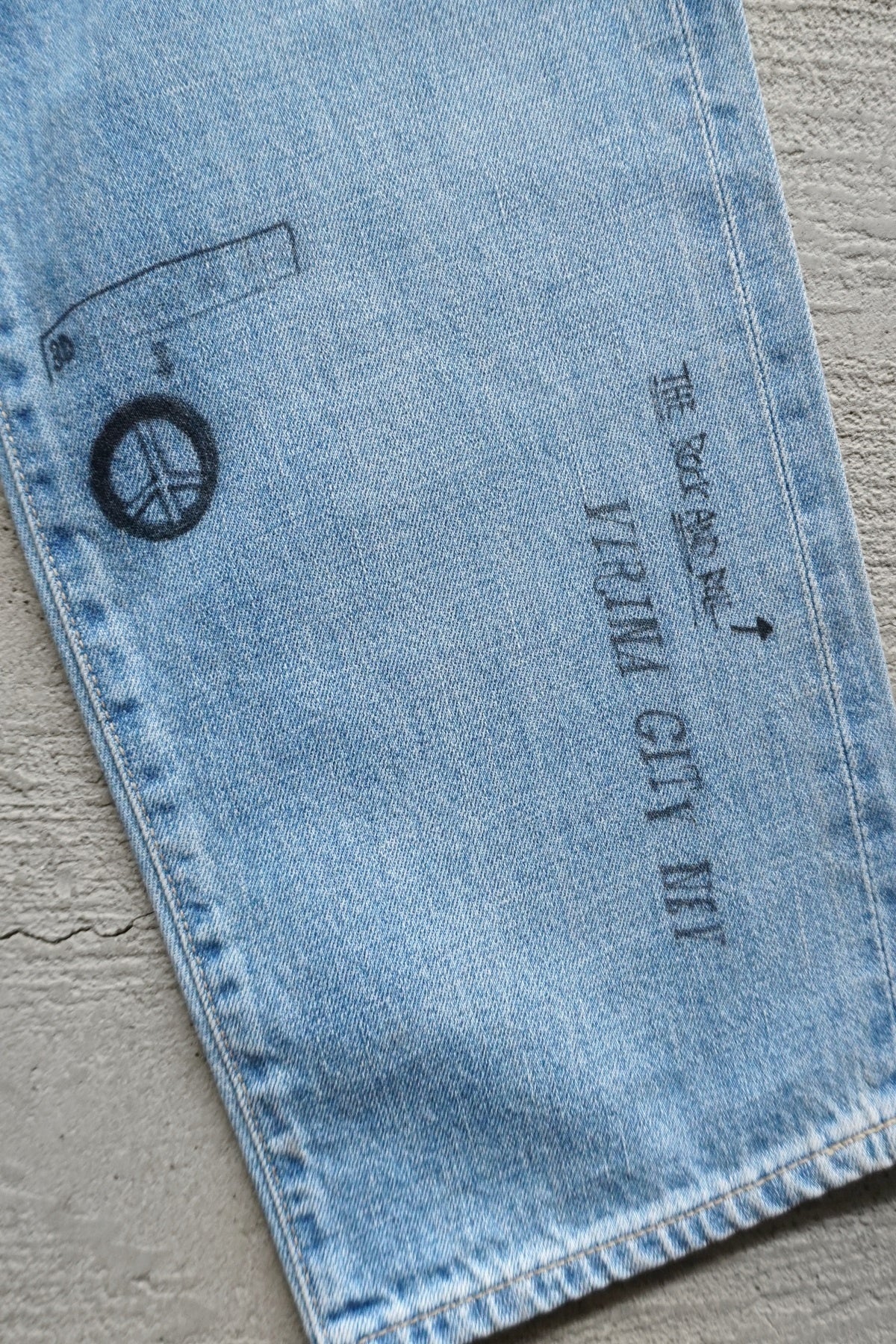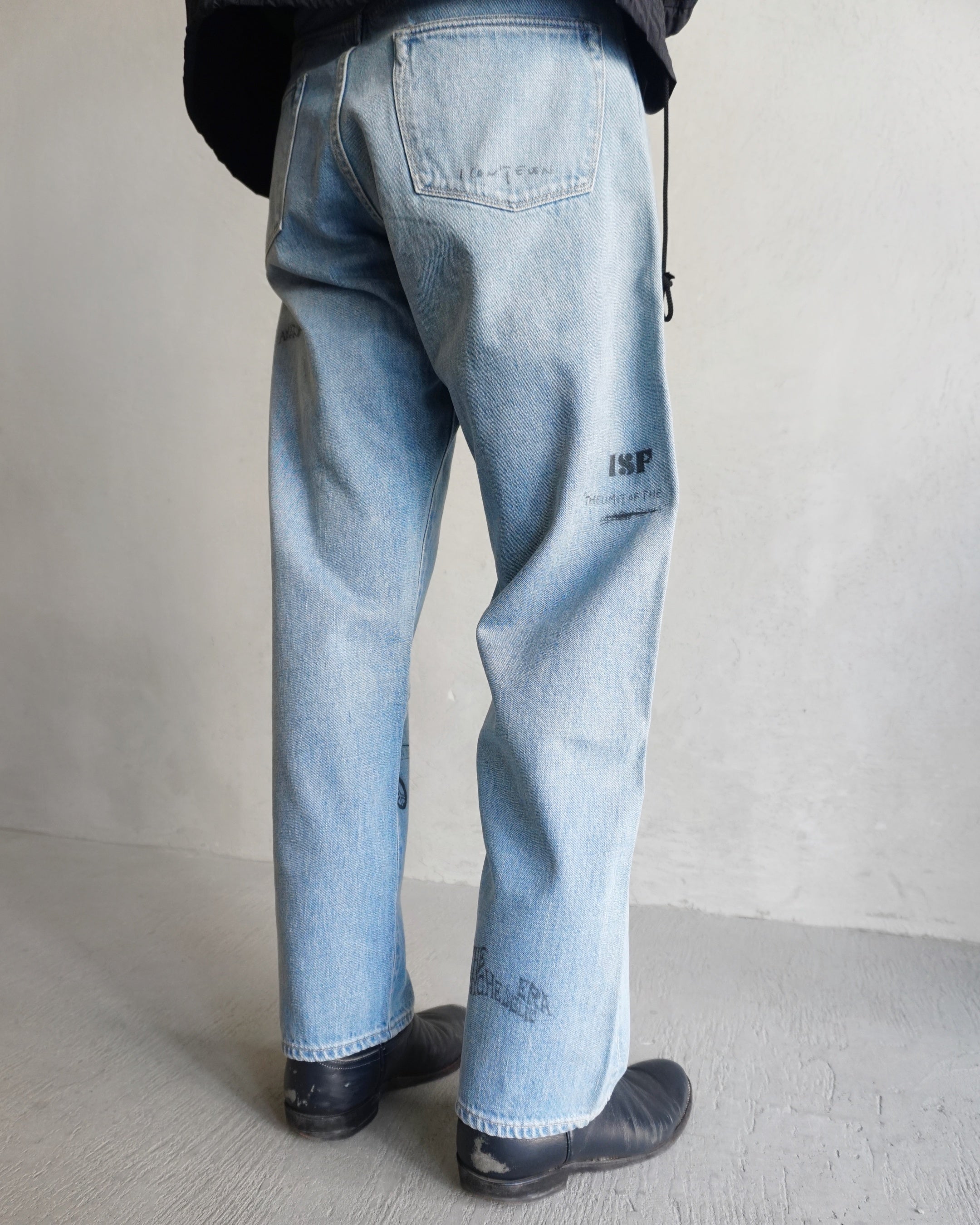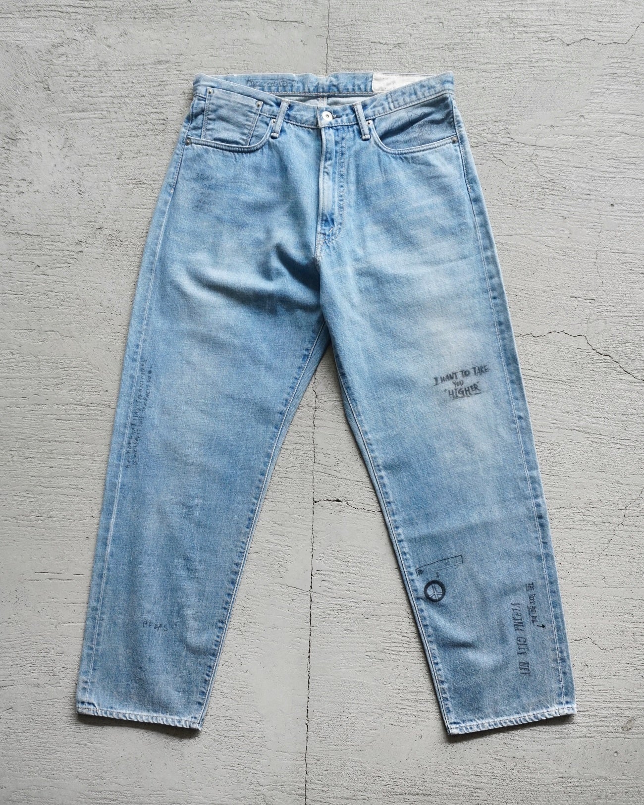 →KUROデザイナー八橋氏による1970年代のロックフェスをキーワードにしたワードを様々な フォントや書体で散りばめたオリジナルの全面プリントが特徴。製品加工後にインクジェットプ リントを行っており、デニムパンツに製品プリントを施せる技術は国内でもごく限られた工場で しか実現できない、KUROのモノづくりの神髄を反映させたプリント。
