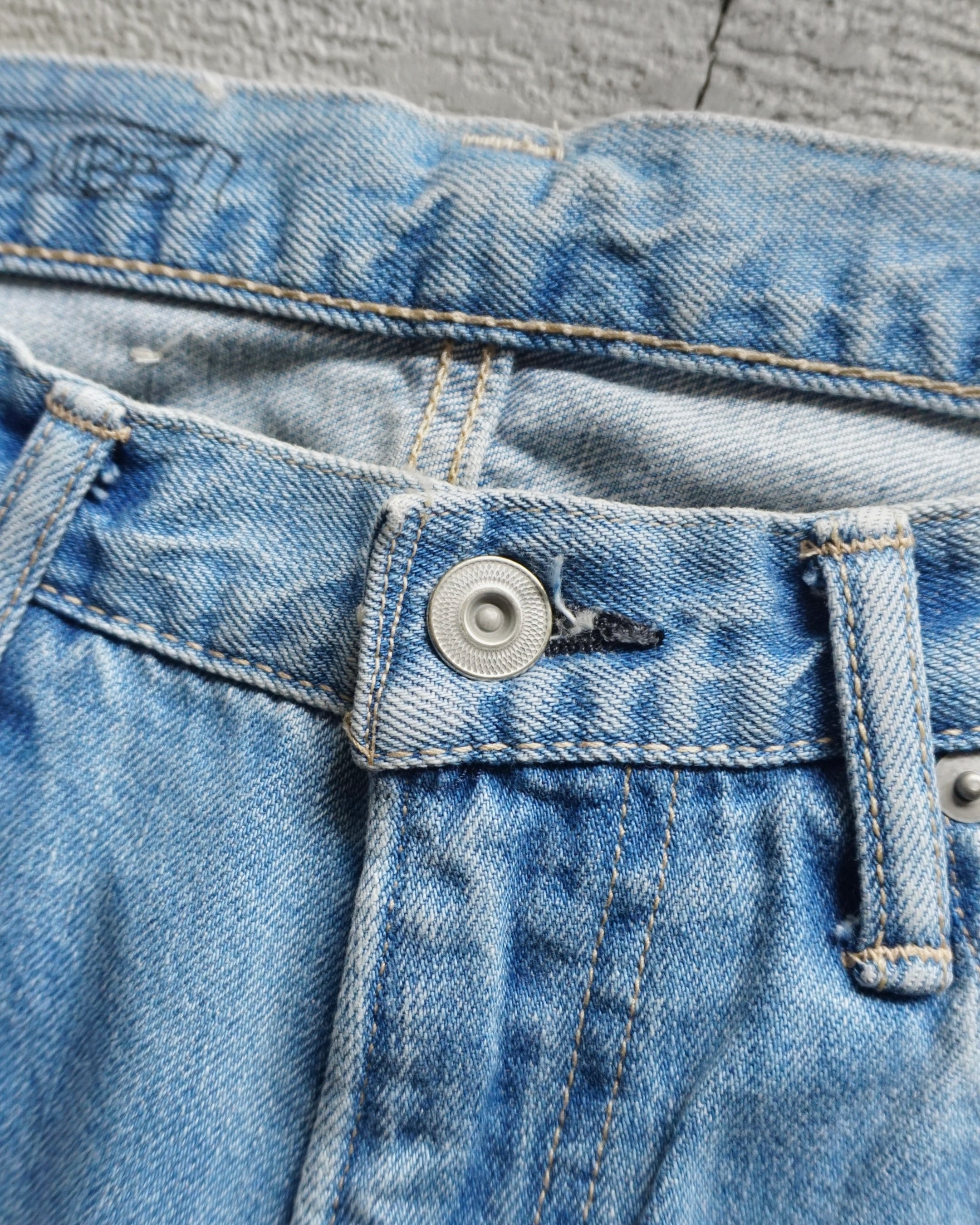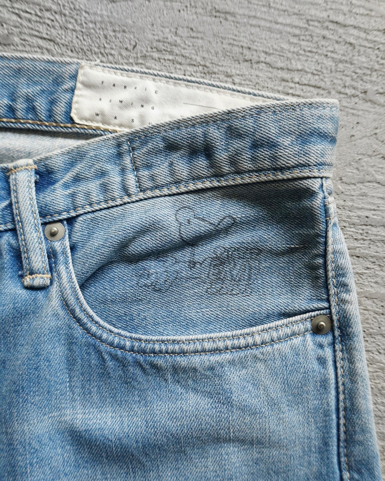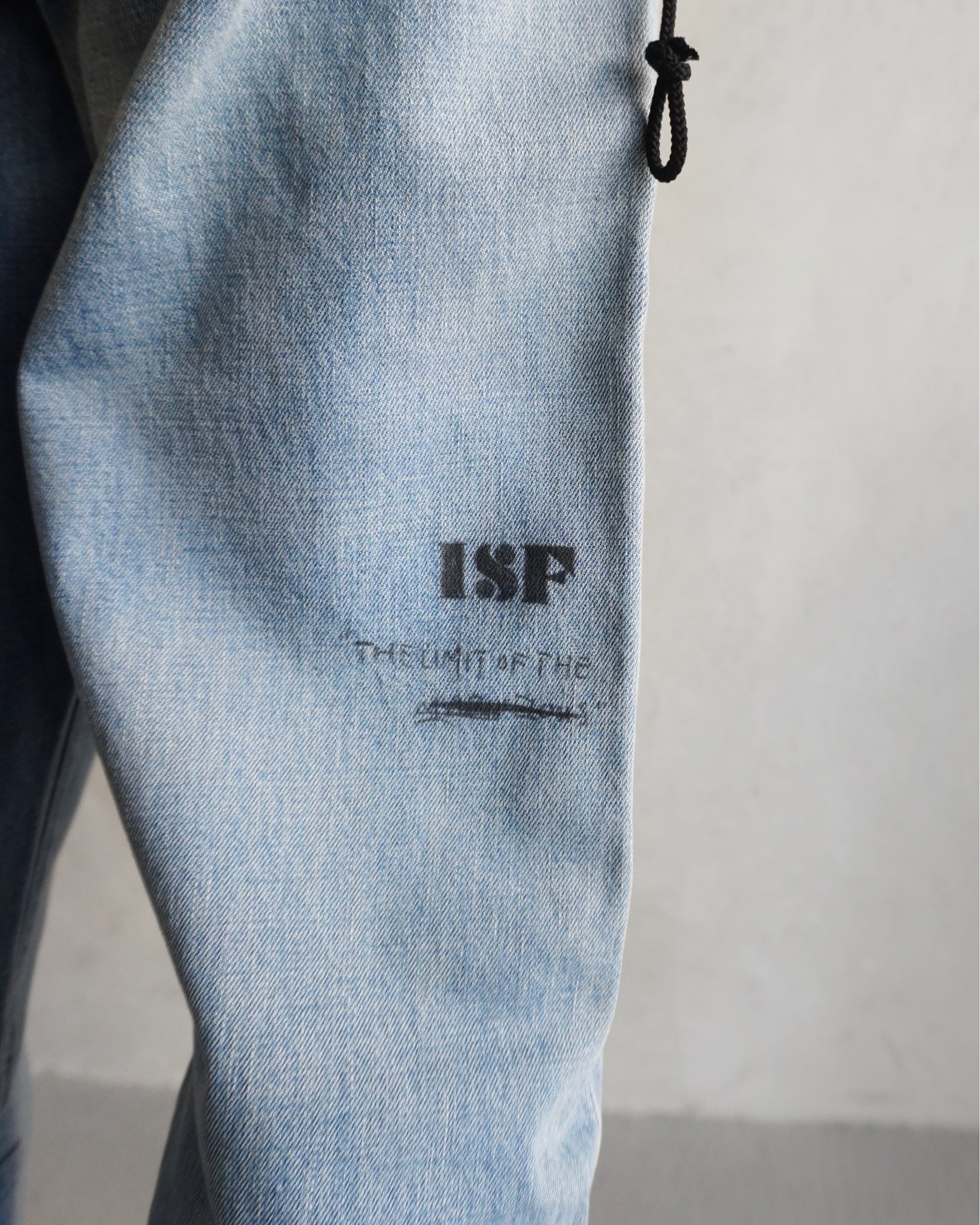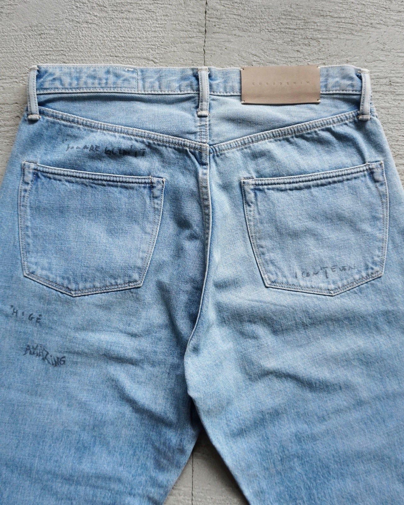 →インラインにない、シェービングやブリーチ、ストーンウォッシュなど複数の加工を重ねて表 現した陰影の柔らかなブルーの表情が特徴。