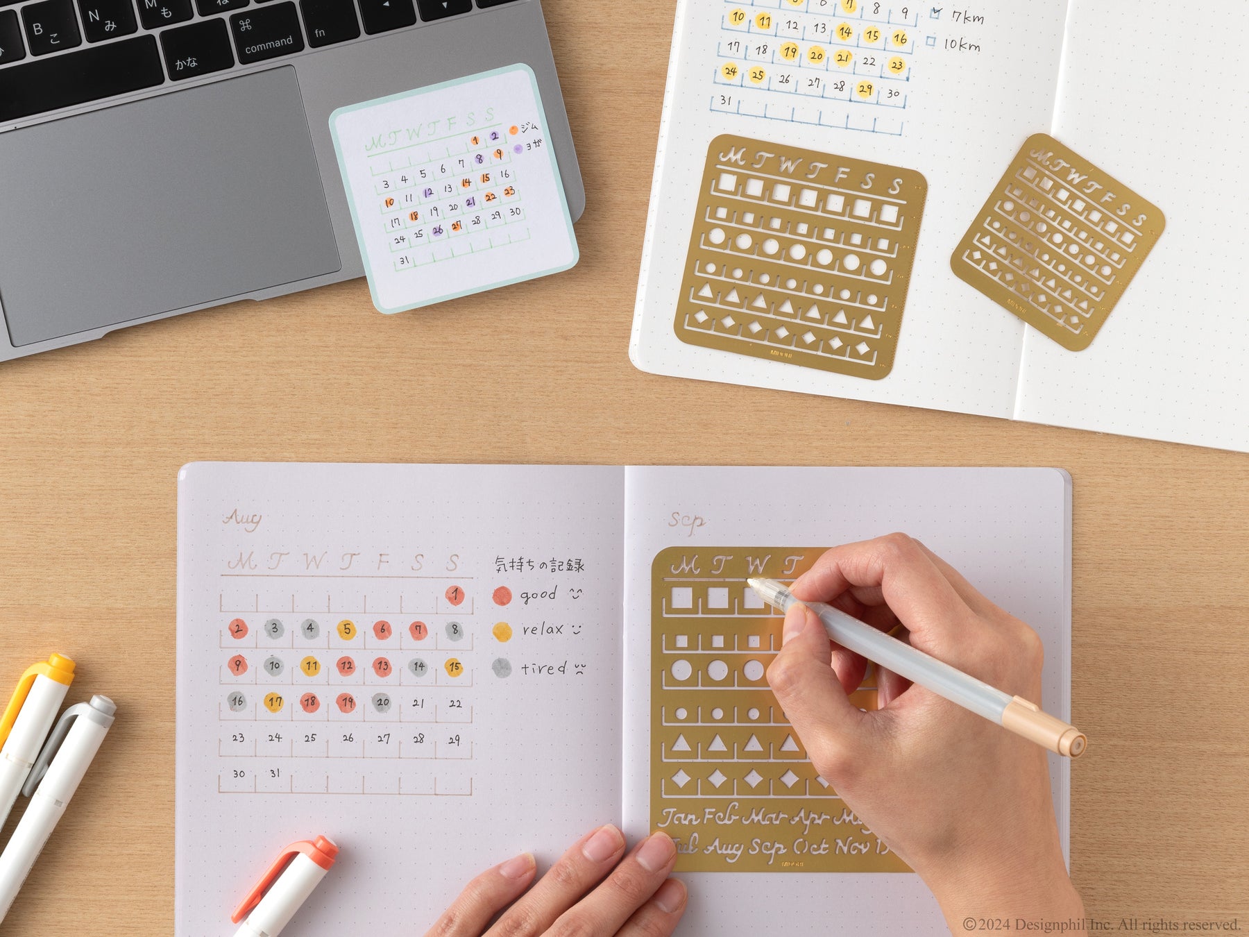 TODO管理に特化したタイプをはじめ、日付が入っていないライフログダイアリーや、初心者にもおすすめのログをサポートするテンプレートなどの手帳アクセサリーも取りそろえます。