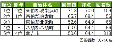 唯一偏差値70台の高い評価を得た東伯郡湯梨浜町が、今年は1位に輝きました。東伯郡湯梨浜町は、「誇りがある」「住みここち」など複数の項目で1位の高い評価を得ている街です。2位は、西伯郡伯耆町です。3位は東伯郡北栄町、4位は八頭郡八頭町(やずぐん やずちょう)で、いずれも昨年は偏差値50未満のため順位非公開だった自治体です。今年のトップ4は、郡部に属する「町」という結果になっています。