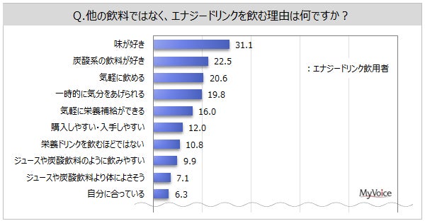 エナジードリンク飲用者の飲用理由は(複数回答)、「味が好き」が31.1%、「炭酸系の飲料が好き」が22.5%、「気軽に飲める」「一時的に気分をあげられる」が2割前後です。