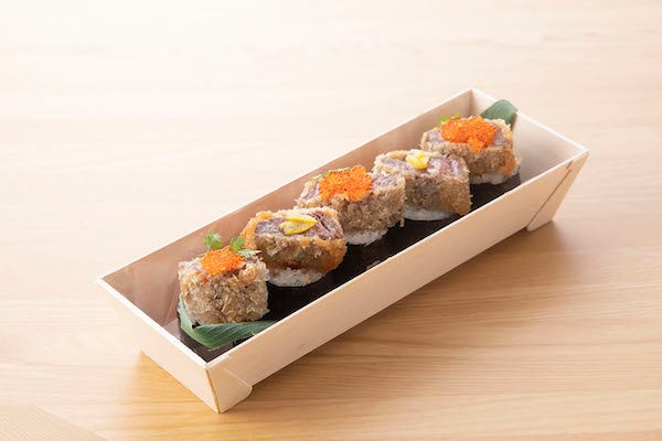 ↑★NEW<むろや>いくら巻き寿司牛カツ乗せ 税込2,376円(5個)/柚子酢飯をしようしたいくらの巻きずしの上に国産の柔らかい牛カツをのせました。