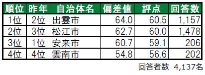 今年は出雲市が1位に輝きました。2位は昨年3位から順位を上げた松江市で、トップ2は、順位の違いはあれど、「住みここち」でもトップ2となっている自治体です。3位は、安来市という結果になっています。