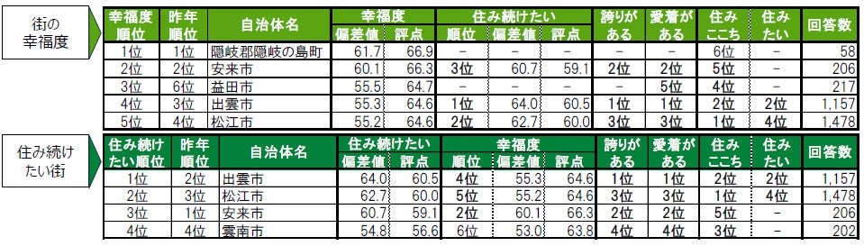 街の幸福度1位は4年連続で隠岐郡隠岐の島町。2位は3年連続で安来市。3位益田市。