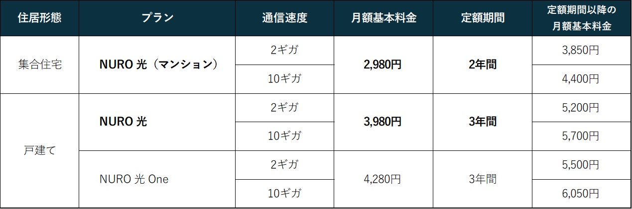 公式サイトから新規で「NURO 光」を申し込んだ方を対象に、集合住宅向けプラン「NURO 光 (マンション)」の月額基本料金が2年間定額、戸建て向けプラン「NURO 光(3年契約)」および「NURO 光 One」が3年間定額で利用可能。
