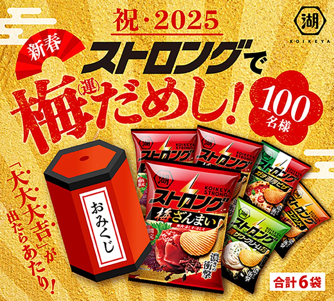 2025年の年始を飾る新商品「湖池屋ストロング 梅ざんまい」の発売を記念して、当商品と定番の「濃サワークリームオニオン」「ガチ濃厚ピザ」「鬼コンソメ」をセットにして100名様にプレゼントするキャンペーンを実施します。今回のキャンペーンでは、「ストロングみくじ(おみくじ)」を引いて“大大大吉”が出たらあたり!年初の運だめしならぬ“梅”だめしに、ぜひチャレンジしてみてください!