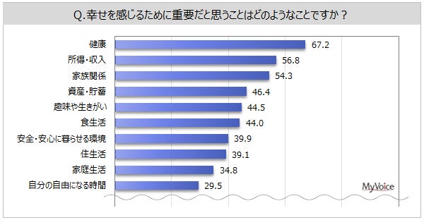 幸せを感じるために重要だと思うことは(複数回答)、「健康」が67.2%、「所得・収入」「家族関係」が各50%台、「資産・貯蓄」「趣味や生きがい」「食生活」が各40%台です。