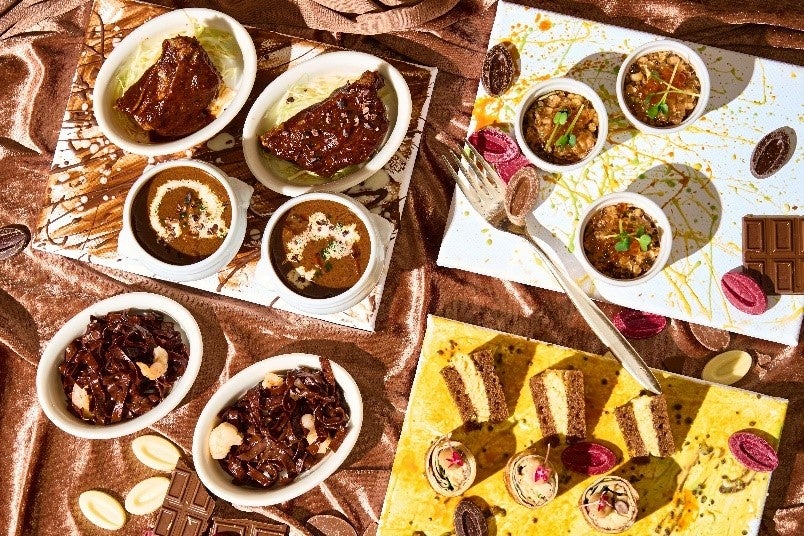 セイヴォリーでは、古くから調味料として使われてきたというカカオの未知なる可能性や知られざる魅力を、お料理の数々を通して存分にお愉しみいただけます。トリュフの豊潤な香りにビターカカオが更なる奥行きを生み出す「エッグとトリュフ ビターカカオサンドイッチ」、カカオドレッシングの酸味が爽やかな「キヌアとシリアルのサラダ」など5種のコールドセイヴォリーのほか、カカオ入りバーベキューソースで煮込み、とろけるようなほろほろの食感に複雑な甘みや旨みが重なり合い押し寄せる「スパイシーダークチョコレート BBQポークリブ」など、テーブルに出来立てをお届けする4種のホットセイヴォリーで、カカオと食材の組み合わせによる旨味の相乗効果をご堪能いただけます。
