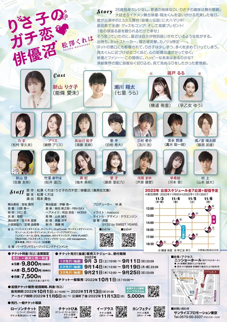 (株)バードランドミュージックエンタテインメント主催、『りさ子のガチ恋♡俳優沼』が2022年11月3日(木)〜6日(日) にニッショーホール(旧ヤクルトホール)(東京都港区東新橋1-1-19 ヤクルト本社ビル)にて上演されます。