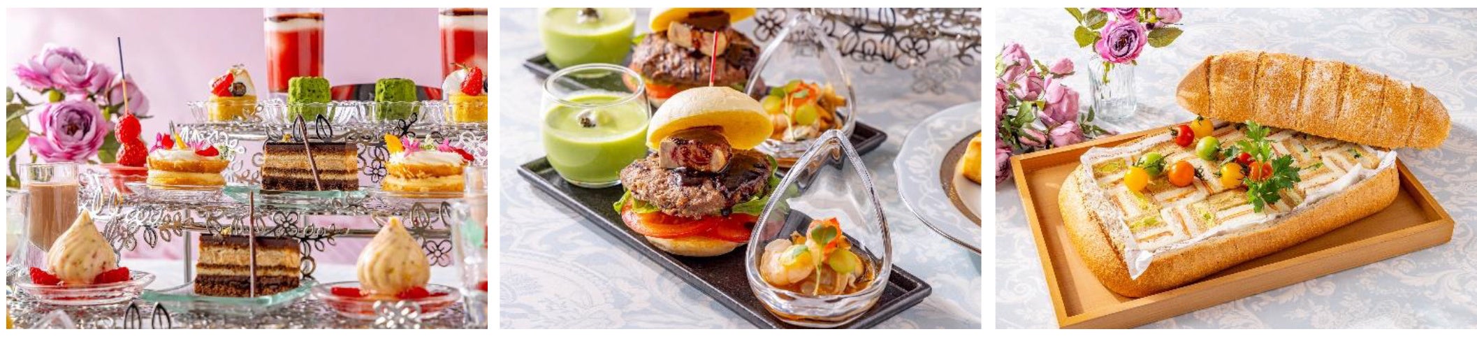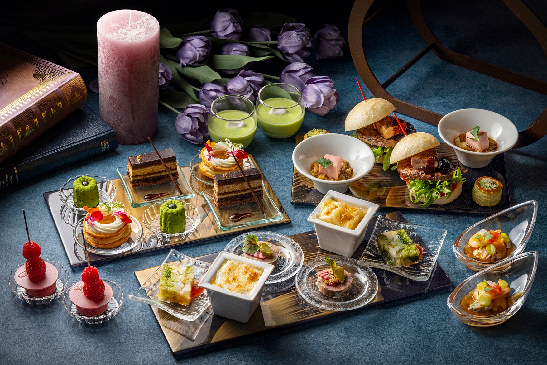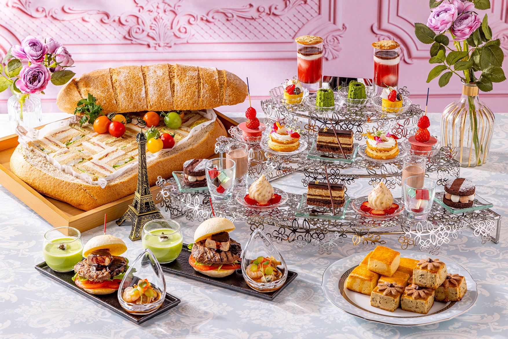 本イベントでは、定番のフランス菓子からアレンジを加えたものまで、バラエティに富んださまざまなスイーツを取り揃えました。カカオ分が35%以上のクーベルチュールを使用したチョコレートが濃厚な「ガトーショコラ」やアーモンドパウダーを使用した生地とコーヒー風味のバタークリームが層になったフランス・パリのオペラ座を模したといわれる「オペラ」をはじめ、フランス・ボルドーの女子修道院が発祥とされ、香ばしくカリっとした食感とバニラ、抹茶の香りがアクセントとなる「カヌレ」、フランスの自転車レースに由来し、その都市の名を冠した「パリ・ブレスト」など、見るだけでも楽しいスイーツがエレガントなアフタヌーンティースタンドに並びます。スイーツとともに楽しめるセイボリーには、春らしくグリーンピースで仕上げた「サンジェルマン」やマルセイユ風のブイヤベースをご用意しています。さらに、ワゴンサービスではおかわり自由のスコーン2種やサンドイッチもご提供します。今年リニューアルしたエレガントなアフタヌーンティースタンドとともにご堪能ください。
