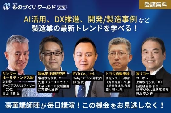 トヨタ自動車/本田技術研究所/BYD/パナソニック ホールディングス/村田製作所/リコー/デンソー/ヤンマーホールディングス/日立製作所等が登壇! 製造業のAI活用・DX推進をはじめ、開発・製造事例について先進企業の取組みを詳しく学べます。更に「カーボンニュートラル」「AM技術の真の普及に向けた取り組み」「EMS戦略」ほか、海外企業の最新動向など、課題に合わせて学べるセミナーを全25講演開催!製造業の最新トレンドを学べるまたとない機会をお見逃しなく!