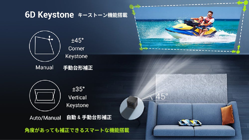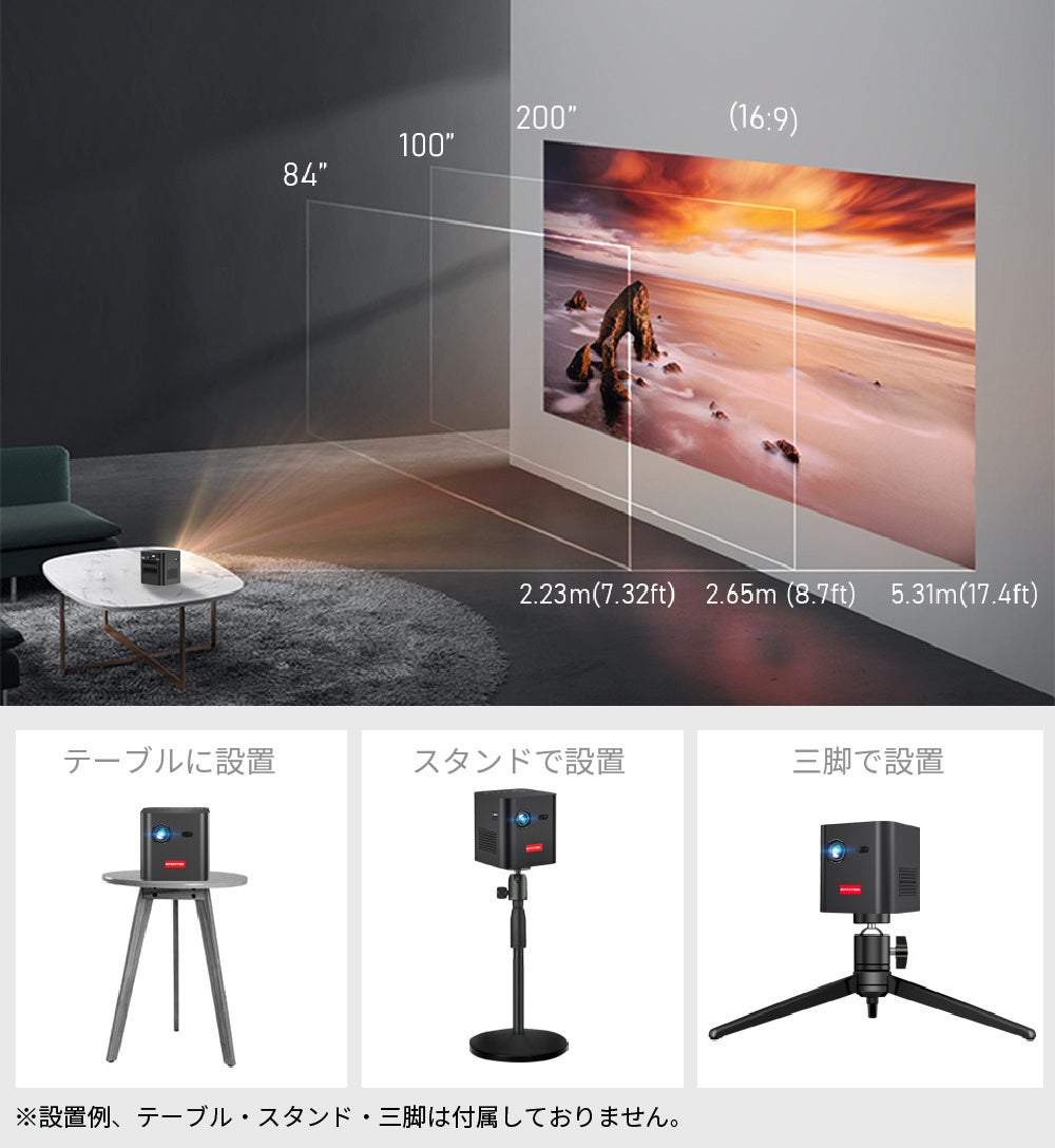 - 最大200インチ大画面、斜めからでも台形歪み補正